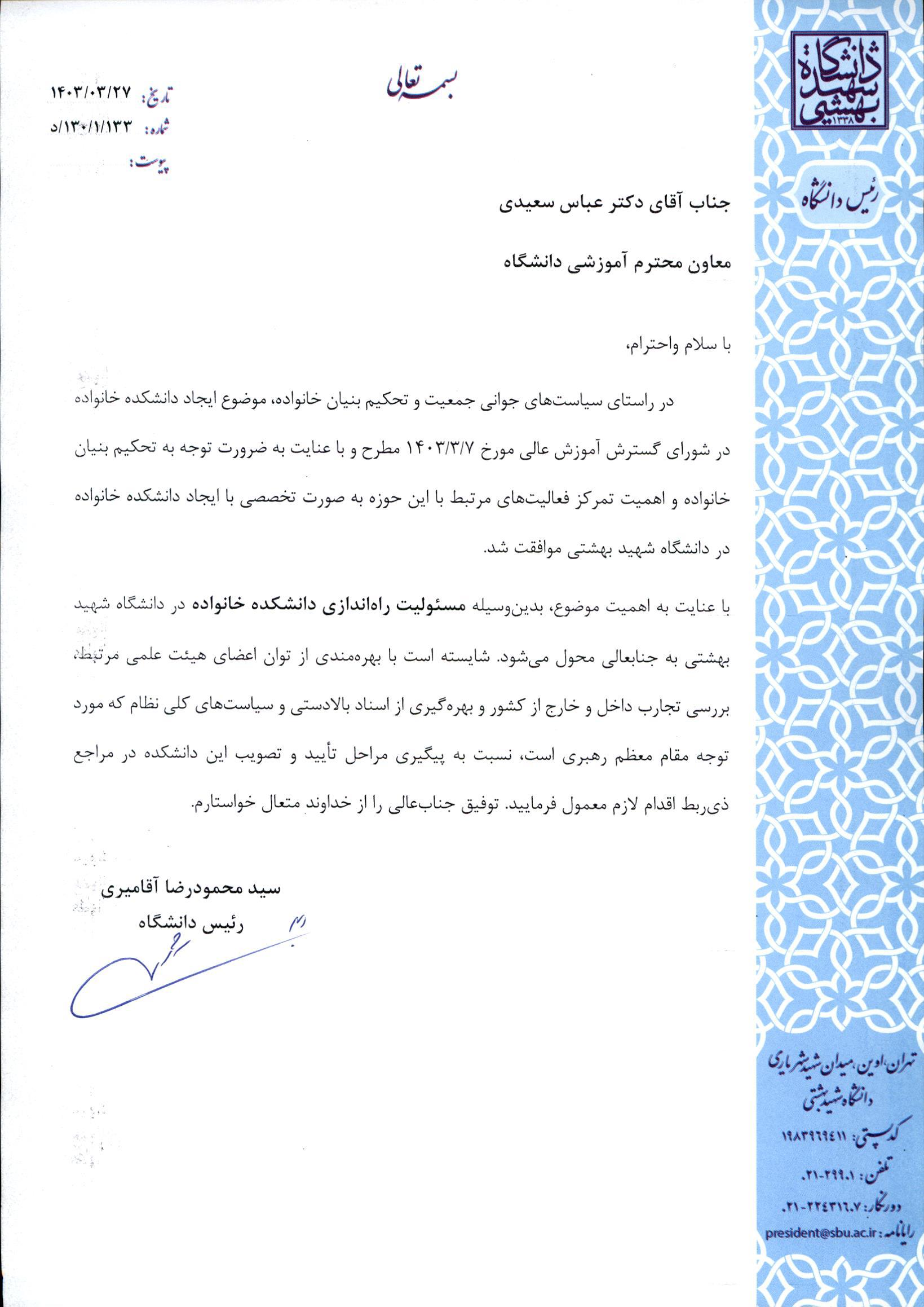 دکتر سید محمودرضا آقامیری، رئیس دانشگاه شهید بهشتی؛ طی حکمی در تاریخ 27 خردادماه 1403، دکتر عباس سعیدی ، معاون محترم آموزشی دانشگاه را با حفظ سمت به سمت مسؤل راه اندازی دانشکده خانواده منصوب کرد.